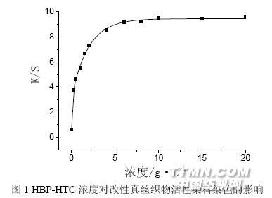 HBP-HTC 改性工藝對真絲織物活性染料染色性能的影響(二)3. 結果與討論3.1 HBP-HTC 改性工藝對真絲織物活性染料染色的影響3.1.1 處理液濃度