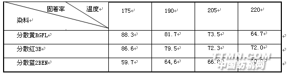 從上表看,溫度升高,染著率反而下降。其中分散藍2BLN屬中溫型染料,它與同屬低溫型的分散黃RGFL和分散紅3B不同的是:它在175-205℃的區(qū)域內(nèi)還是隨著溫度升高而染著率同步上升,只是到了220℃才開始下降。在分散染料中凡是相對分子質(zhì)量較小、極性基團較少的偶氮系(如分散黃RGFL)和相對分子質(zhì)量較小的蒽醌系(如分散紅3B和分散藍2BLN)都是容易升華或比較容易升華的染料。在熱熔染色時大量氣化的染料分子來不及被滌綸吸附,就散在空氣中,使設(shè)備沾污和滌/棉織物的棉纖維部分沾污。對染料來說造成浪費。所以說,這三種染料并不適合熱熔染色。