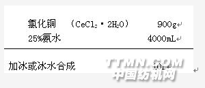 化料方法:將氯化銅放入搪瓷或塑料桶內,加2—3L冰水使其溶解,再加入氨水成為銅氨溶液,完全溶解后加冰水冷卻,將桶蓋好。 乙液: