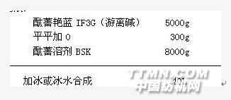 化料方法:先用熱水將平平加O溶解,冷卻待用。將染料放在搪瓷缸內加冰水調成薄漿狀,用篩子過濾,加入已溶解冷卻的平平加O,攪拌均勻,再加入酞菁助溶劑后攪拌,均勻后染料顏色若轉變,說明染料已部分溶解,再直接加入氨水,邊攪邊加。加畢后染料應全部溶解成棕色的澄清溶液,再加入適量的冰或冰水,液溫保持在10℃左右。 溶液的PH值用氨水調整到10—11左右,一般25%的氨水與溶劑的用量比為1:1。 以乙液中酞菁艷藍IF3G以游離堿的形式存在,不必加燒堿,染料本身無強酸性,故不必加醋銨。 臨用前,將甲、乙液拼混在一起,加冰水合成100L,染液PH值9.5—10.5。配制好的染液,不宜放置過久,防止染料產生沉淀。 2.工藝流程及條件 工藝流程: 浸軋染液→預烘→焙烘→(或汽蒸)→后理→烘干 (1)浸軋染液。一般采用二浸二軋,滲透效果好,軋余率為60%—70%,軋染溫度低于20℃,開車摻水10%—15%,軋槽溶劑宜小,保持低溫新鮮,減少染料損失。為了保持低溫,軋槽應是架套,內加冰塊。同時軋槽內裝有擋板,以防泡沫漬沾上織物造成色漬。半制品布面PH值6.5—7。如帶堿用軋淡醋酸烘干來解決。配好的染液不能再加