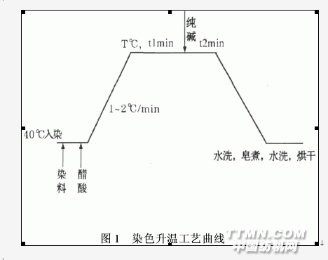上染百分率低,國內試制了一類具有β-羥基乙烯砜暫溶性基團的活性分散染料,其染料母體中無水溶性基團,染色如用普通活性染料上染,經堿液處理后,脫去硫酸酯基轉變成不溶于水的乙烯砜基,此時水溶性很小,可像分散染料一樣上染纖維,同時乙烯砜基可與纖維上的氨基發生共價結合.1.2 實驗儀器與試劑活性黃M-3RE(宜興)、活性深藍M-2GE(宜興)、活性艷紅M-3BE(宜興)、元明粉、純堿、醋酸;恒溫水浴鍋、玻棒、200ml容量瓶、100ml燒杯、量筒、移液管、洗耳球、溫度計、電子天平、電腦測色配色儀、pH測試儀.1.3 活性染料上染錦綸染色工藝1.3.1 染色處方和工藝條件活性染料(對布重4%) xg/l純堿yg/l元明粉20g/l醋酸zg/l浴比1∶501.3.2 染色工藝曲線(圖1)