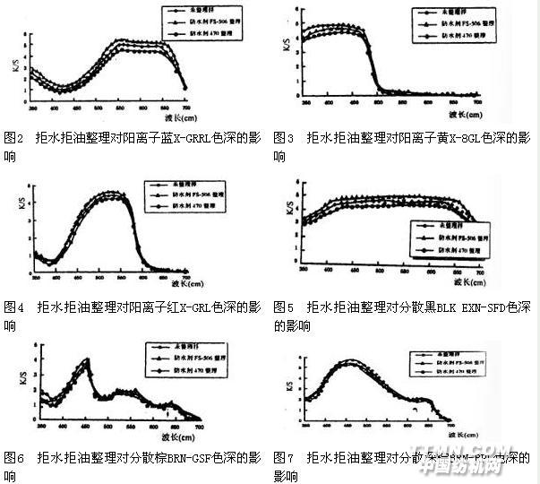 將普通滌綸和陽離子可染滌綸的染色織物分別用防水劑FS-506和防水劑470按它們的優化工藝條件進行整理,然后用測色配色儀測定織物整理前后的表觀色深變化情況,結果見圖2-圖7及表2。
