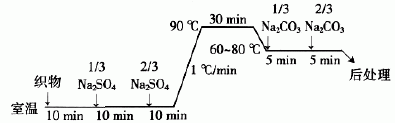 后處理:水洗后在3g/L皂液中(浴比1∶50,95℃)皂煮5min,水洗后晾干.1.4測試樣品表面色深(K/S)值、色光(L*、a*、b*、C*)采用測色儀測量,10°視野,D65光源,試樣折疊4層;上染率E=[(A0-At)/A0]×100%,其中A0為染色前染液吸光度,At為染色后殘液吸光度;固著率F=[(K/S)1/(K/S)0]×100%,其中:F表示和纖維鍵合的染料占上染到纖維上染料總量的百分數,(K/S)0、(K/S)1分別為皂煮前后織物的表面色深;總固著率T=E×F×100%,表示與纖維鍵合的染料占投入染浴中染料總量的百分數;耐摩擦色牢度按GB/T3920-97測試;耐洗色牢度按GB/T3921-97(方法一)測試;勻染性:在測色儀上對染色樣品均勻取樣,在各部位隨機測定20個點的K/S值,計算其標準偏差.