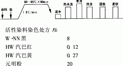 棉用活性染料采用Lanasol染色工藝浸染絹絲散纖維,高溫沸染60~90min,使染料充分上染絲素,不必加堿。然后堿水洗→氨水洗→熱水洗→酸化→固色→柔軟。染料以直接或酸性染料的上染方式固著在纖維上。1.2 乙烯砜型或一氯均三嗪型活性染料染絹絲棉用活性染料乙烯砜型或一氯均三嗪型染絹絲、柞蠶絲,其工藝與Lansol染料系列相仿,工藝條件和工藝處方如下: