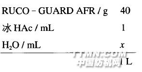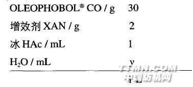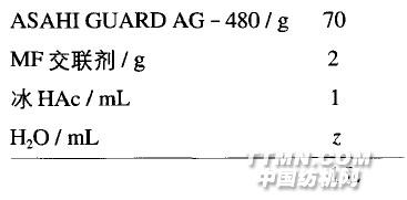 工藝流程:二浸一軋(軋液率70%)一烘干《115 'C 2 min一焙烘(150'C,5min)。3) 工 藝 處方3