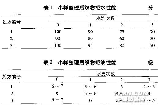 工藝流程:(軋液率70%)一烘干(115 'C , 2 min)一焙烘(150'C,4min)。1.1.4 水洗將以上3 種打樣布做記號(hào)后稱重加入同等重量和大小的全棉半漂布放入家用滾筒洗衣機(jī)中水洗,浴比1:30水溫40℃ 洗滌劑2g/L 時(shí)間巧min。取出試樣拋干放入家用滾筒烘干機(jī)中烘干。共重復(fù)3次每次洗滌烘干后在室溫狀態(tài)下放置Ih,再做拒水拒油測試。1.1.5性能測試拒水性 : 按國標(biāo)GB