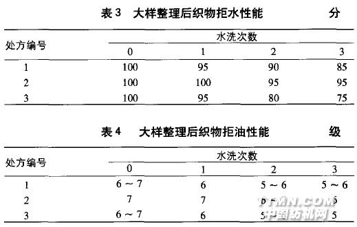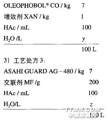 2.1.4工藝流程配工作液一浸一軋(軋液率70%)一雙面2組紅外線預(yù)烘一雙組烘房預(yù)烘一烘筒烘干一焙烘(150士3'C) - 3個(gè)冷水輥冷卻一落布,車速20 m/min,2.2 大樣生產(chǎn)測試結(jié)果大樣生產(chǎn)后,織物拒水及拒油性能測試結(jié)果分別如表3和表4所示。