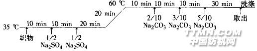 1.2.4 竹纖維防紫外整理(1)納米分散體系防紫外整理將上述納米分散體系與一定量粘合劑、交聯劑等配制成穩定的整理液,采用軋一烘一焙工藝對竹纖維進行整理:二浸二軋(軋余率65% ~70%)一預烘(80~90℃ ,2~3 min)一焙烘(160~180 oC,1~3 min)。(2)紫外吸收劑防紫外整理由于所選紫外吸收劑具有活性染料的某些性質,因此,采用浸染法整理織物,并研究紫外吸收劑對纖維的吸附百分率及平衡等溫吸附曲線。參考配方/(g/L)RAYOSAN C/%(owf) 0.5~3Na2SO4 80