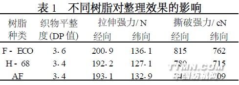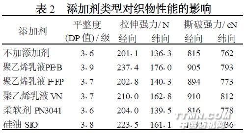 2、3 添加劑的影響采用添加劑改善織物的整理效果, 表2 例舉了幾種添加劑的使用效果。從表2 看出, 不同添加劑對整理后織物的性能有很大的影響。加入添加劑
