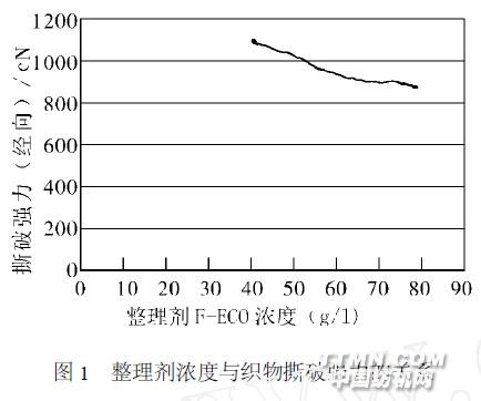 由表1 知, F - ECO 樹脂整理織物的平整度最好DP 值最大, 拉伸強力和撕破強力也較好, 因此選用樹脂整理劑F - ECO 做進一步試驗。2、2 整理劑濃度的影響整理劑的濃度過高, 會使織物的強力下降(見圖1 ) 。但是,整理劑的濃度過低,織物的抗皺性差。