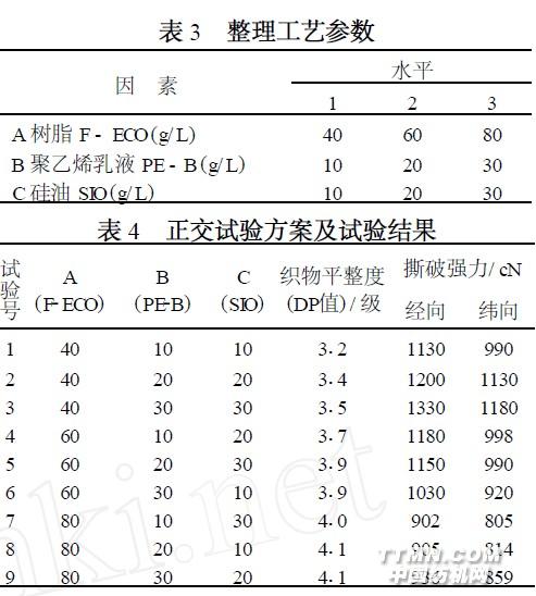 綜上所述, 通過單因素分析, 采用樹脂整理劑F - ECO , 添加劑聚乙烯乳液PE - B 和硅油SIO 進行試驗較好。2、4 工藝優化為了優化工藝配方, 筆者對影響整理效果的主要因素采用L9 (3的3次方) 正交試驗, 以獲得最佳工藝配方。三個因子為整理劑濃度、聚乙烯乳液PE - B濃度和硅油SIO 濃度; 每個因子分3 個水平進行研究, 焙烘條件為150 ℃×3min , 整理效果用織物平整度(DP 值) 和織物撕破強力來評價(表3 ~表5) 。.jpg)