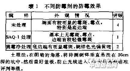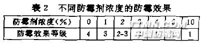 從表l可看出,SAQ_1防霉荊有較好的防霉效果,對(duì)織物外觀影響甚小,可作為真絲剌繡綃的防霉處理用劑2. 防霉劑處理液濃度選擇分別取不同濃度SAQ-t防霉劑,將真絲刺繡蛸(2 g/塊)以l:10浴比在35~40"C浸漬處理3 omin,擠去溶液,培烘(1O0~120℃)5 min,再采用土埋法對(duì)比觀察實(shí)驗(yàn),按標(biāo)準(zhǔn)評(píng)定結(jié)果.見表2。