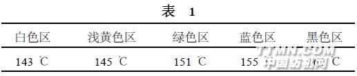 幅定形機上。紡織品均由高分子化合物組成, 它主要吸收中、遠紅外波段紅外輻射能。因此, 只要在應用紅外輻射過程中調整好紅外輻射器的發射光譜, 使其覆蓋絕大部分紡織品吸收波段上, 并解決好紅外加熱溫度的均勻度問題, 即可達到節能高效、應用方便等效果。近來, 我們遇到有些廠家將紅外輻射加熱器安裝于印花布及色織布的定形機上, 應用均不理想。主要表現在不同顏色定形后的效果不同, 深顏色染料升華嚴重, 甚至造成布纖維的損壞; 而淺顏色則定形溫度不夠, 兩者溫差過大。造成這種現象的原因主要有以下三點: (1) 以往在樹脂整理、預烘脫水或定形工藝上應用, 布面是單一材料, 而色織或印花布, 則其色彩不同, 即不同區域染化料構成不同; (2) 不同顏色染化料其分子構成存在差異, 從紅外加熱匹配吸收原理知道, 不同物質即使在同一輻射場下, 其對紅外能量的吸收性能是不同的, 得到的熱量是不一樣的, 溫度升高也不盡相同, 這是造成不同顏色染料間溫差的主要原因; (3) 紅外輻射具有光的特性(特別在近、中紅外波段) , 不同亮度的染料對紅外線的吸收性、反射性不相同, 基本上遵循深顏色吸收率較高, 而淺顏色吸收率較低的規律。對此, 我們進行了實驗, 將一滌棉印花布放置于一紅外輻射器下(紅外輻射器熱源溫度758 ℃) , 12 s 后測得布面不同區域溫度如表1。
