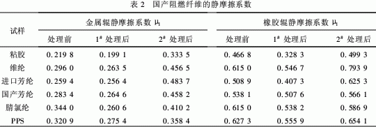 從表2中可以看出,經1#抗靜電劑處理后,阻燃纖維與金屬輥、橡膠輥的靜摩擦系數均有所下降.說明 1#抗靜電劑對阻燃纖維的靜摩擦作用影響較大,改善了纖維與金屬輥、橡膠輥之間的靜摩擦作用.而且阻燃 纖維與橡膠輥的靜摩擦系數下降的程度要比與金屬輥的明顯.經2#抗靜電劑處理后,只有腈氯綸與橡膠輥 之間的靜摩擦系數有所下降外,其他的都有所增加.說明2#抗靜電劑對阻燃纖維的靜摩擦作用效果小.