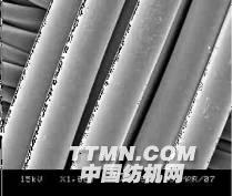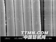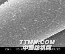 圖5 是用傳統(tǒng)方法進行前處理后織物的電鏡照片。即先用NaOH粗化,后用氯化亞錫敏化,最后以鈀鹽在纖維表面發(fā)生氧化還原反應(yīng),形成具有催化活性的金屬鈀薄層。