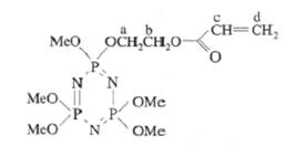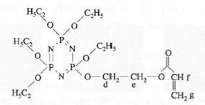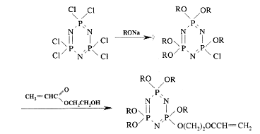 利用六氯環(huán)三磷腈分子結(jié)構(gòu)中活潑的P-Cl鍵與親核試劑脂肪族醇鈉(R-ONa)進(jìn)行親核取代反應(yīng),制得了五烷氧基環(huán)三磷腈,后者再與丙烯酸羥乙酯反應(yīng)得到五烷氧基環(huán)三磷腈丙烯酸酯.反應(yīng)式如下: