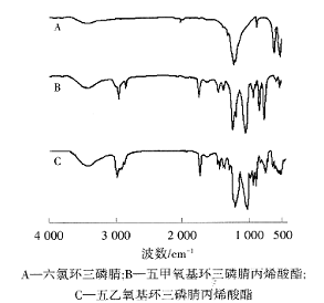 五甲氧基環(huán)三磷腈丙烯酸酯紅外光譜圖B,除保持有磷腈環(huán)骨架的特征吸收峰以外,P-Cl鍵的強(qiáng)吸收峰基本消失,表明取代反應(yīng)基本完成。