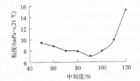 由 圖1可知,中和度低于90%時,粘度隨中和度的增加而減小,超過100%時,由于親水性強,流動性變差,粘度急劇上升.因此,中和度宜控制在90%-100%。