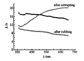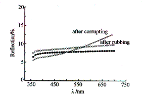 圖1 表明,織物經摩擦及鹽霧腐蝕后其K/S值也發生明顯的變化,但這并未影響到它原有的良好吸光率(見圖2,摩擦及鹽霧腐蝕后,織物的反光率僅9%左右,即吸光率約91% ).