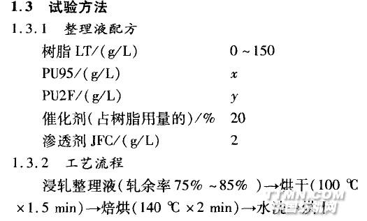 免燙整理可改善純棉織物的服用性。但單獨使用樹脂進行免燙整理交聯時,高溫和酸性催化劑會促進纖維素大分子降解,使得整理后織物的強力下降比較嚴重。純棉薄織物的基礎強力絕對值較低,免燙整理后織物強力下降會更嚴重。因此,既保證達到免燙效果又不降低織物強力保留率是企業生產中急需解決的問題。 聚氨酯(PU)是分子結構中含有一NHcOO一單元的高分子化合物,它具有良好的成膜性和彈性,在免燙整理中作為添加劑,可以明顯提高織物的回彈性,減少強力損失。 本試驗將聚氨酯和免燙樹脂復配,用于免燙整理,研究了相關工藝條件和影響因素 刮,以使整理后的織物具有高強力保留率和理想的免燙效果。1 試驗部分1.1 材料和儀器織物14.8 tex×14.8 tex 524根/10 cm x283根/10 cm半漂平紋棉織物。藥品免燙樹脂整理劑LT,水溶性聚氨酯交聯劑PU95,水溶性聚氨酯交聯劑PU2F(上海市紡織科學研究院)。設備KLFH—K型軋車,電子天平(上海光正醫療儀器有限公司),YG541 B型織物折皺彈性測試儀(寧波紡織儀器廠),Pro—Tear織物撕破強力機(美國Thwing—Albert公司),HIOKS萬能強力機(英國Hounsfield公司)。1.2 測試方法 織物斷裂強力和斷裂伸長率采用H10KS萬能強力機,按GB/T 3923.1一l997《紡織品織物拉伸性能第一部分:斷裂強力和斷裂伸長率的測定條樣法》進行測試,測織物3經3緯,分別取平均值。 織物撕破強力 采用Pro.Tear織物撕破強力機,按GB/T 3917.1—1997《紡織品織物撕破性能第l部分:撕破強力的測定沖擊擺錘法》進行測試,測織物3經3緯,分別取平均值。 織物折痕回復性采用YG541B折皺彈性儀,按GB/T 3819-1997(紡織品織物折痕回復性的測定回復角法》測