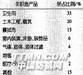 在對非織造材料卷材加工成最終產品的調查中,發現衛生和個人護理產品占有最大份額。這類產品的消費量非常高,因為這些應用中包括很多一次性使用的產品。如紙尿褲和擦拭布(表1)。衛生和個人護理領域應用的非織造材料通過后整理所具有的性能主要有:-親水性;-耐久的親水性;-柔軟性;-吸收性;-合適的復合性能,例如:親水性與柔軟性。表1 非織造材料終端應用情況