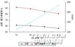 2.試驗部分2.1試驗材料2.1.1織物及其基本性能經退漿、煮練、漂白的本色純Richcel平紋機織物,其基本性能:折痕回復角181°;經向斷裂強力是481N,緯向則為300N;白度值65.02(甘茨)。2.1.2試劑和藥品 檸檬酸(CA),次磷酸鈉(SHP),三乙醇胺(TEA),氫氧化鈉,硫酸,這些藥品均為分析純;柔軟劑LD 6520,石家莊環城生物化工廠2.1.3儀器和設備 實驗用小軋車(日產NM一450型);焙烘機(日產DK-5E型);WSD-Ⅲ型白度儀(北京康光公司產);YG06型電子織物強力儀(萊州)2.2 工藝試驗 整理液處方 (g/L) 檸檬酸 70~120 次磷酸鈉 與檸檬酸的質量比6:7 柔軟劑LD 6520 10 三乙醇胺 15~30 整理工藝條件二浸二軋(軋余率80%左右)→預烘(90℃,2min)→焙烘(150~190℃, 90~200s)2.3性能測試折皺回復角:按GB 3819-97方法測定;白度: 按GB8425-87方法測定;斷裂強度: 按GB3923—83方法測定。
