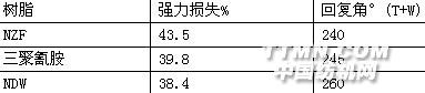 2 實驗部分2·1 實驗設備及織物、工藝流程2·1·1 實驗設備 瑞比軋烘焙聯合小樣機2·1·2 實驗織物規格 43/44" 8/8 42×38混紡苧麻棉織物2·1·3 工藝流程 一浸一軋(帶液率65%)→預烘→焙烘2·2 工藝條件的篩選2·2·1 樹脂選擇 樹脂:科萊恩樹脂NZF(乙二醛類),六羥甲基三聚氰胺,科萊思樹脂NDW(醚化2D樹脂類)。工藝處方:樹脂 100g/L、催化劑MgCl2 20g/L工藝條件: 焙烘溫度l60℃,時間3Min表1 不同樹脂對抗皺效果的影響