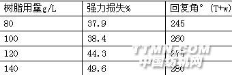 注:回復角(T+w)為緩彈回復(下同) 由表1可看出,強力損失NDW最小,回復角最大。這主要是因為苧麻的結晶區較多,醚化2D樹脂類的分子量比較小,容易進入纖維內部進行化學反應。今后實驗均采用科萊思樹脂NDW。2·2·2樹脂用量對抗皺效果的影響 工藝處方:樹脂NDW: Xg/L、催化劑MgCl2為樹脂用量的20%、纖維保護劑SVN 20g/L。 工藝條件:焙烘溫度l60℃時間3min表2 樹脂用量對抗皺效果的影響
