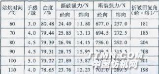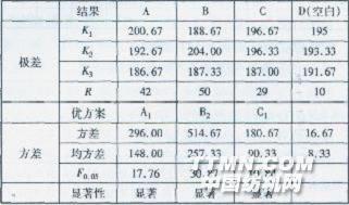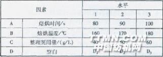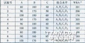 從表3可以看出,隨著焙烘時間的延長,整理后織物的手感變好,但是達到一定時間后,手感會變硬;而織物的白度則隨時間延長而下降。 棉織物的強力隨焙烘時間延長而提高。這是因為棉織物主要靠纖維間的抱合力產生抗張強度,經整理后,棉纖維與整理劑發生化學反應而互相交聯作用,使纖維之間的相對滑移變得困難。因熱作用會使棉纖維受損,焙烘時間過長對棉織物的強力不利。 隨著焙烘時間的延長,織物的彈性回復角增大;但達到90 s后,回復危略有下降。這是因為焙烘時,整理劑主要與無定形區的纖維素大分子發生交聯,提高了纖維素大分子在外力作用下變形的回復能力,即提高了織物的回彈性。當焙烘達到某一時間,樹脂與相鄰纖維素大分子間的交聯鍵數恰好使纖維素具有最大的彈性回復性能,所測回復角達到最大值;如果再延長焙烘時間,隨著反應的進行,將會有更多的樹脂與纖維素大分子發生交聯,相鄰大分子間的連結點數不斷增加,交聯密度增大,阻礙了纖維素大分子的移動,降低了織物的回彈性,回復角反而變小。綜合考慮,焙烘時間以80—100 S較好。2.2正交試驗 以聚氨酯有機硅整理劑的用量(A)、焙烘溫度(B)、焙烘時間(c)作三因素,進行正交試驗,結果如表4—6。表4因素水平表