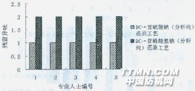 圖6三項試驗引起異味排序表以上表中的工藝編號對應(yīng)的工藝見表3。三項實驗結(jié)果表明:堿劑的純度也不是引起異味的原因;此氯化防縮工藝必然引起異味,整個工藝過程中還原劑的種類不同,產(chǎn)生的異味差別并不大。3.4單、雙項實驗結(jié)果對比 5位后整理專業(yè)人士將單項和相對應(yīng)的雙項實驗所引起的異味大小排序情況見圖7、8、9。