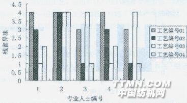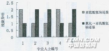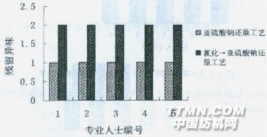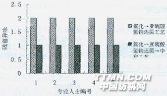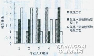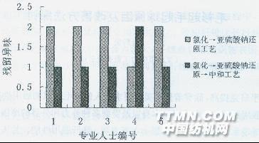 圖5雙項試驗還原劑不同(分析純)引起異味排序表 雙項實驗結(jié)果表明:還原劑的純度不是造成異味的原因;氯化后,還原過程用亞硫酸鈉或亞硫酸氫鈉都引起異味,兩者差別不大。3.3三項實驗結(jié)果 5位后整理專業(yè)人士將4種工藝處理出來的異味大小排序情況見圖6。