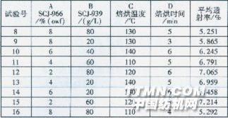 2 抗紫外線整理影響因素優化 選擇抗紫外線整理劑濃度、固著劑濃度、焙烘溫度、焙烘時問等四個主要因素,以長波紫外線(315~400 nm)在竹纖維織物的透射率作為評價指標,利用正交試驗法,對經不同試驗方案整理后的織