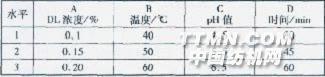 圖1溫度、pH值對纖維素酶DL酶活力的影響 由圖1可知,溫度在40~60℃、pH值為4.5~6.5時,纖維素酶DL的酶活力相對最好,固定酶洗柔軟整理的浴比(1:20)和滲透劑JFC濃度,進(jìn)行L9(3 4)正交試驗,見表1~3。表1 L9(3 4)正交試驗因素水平表