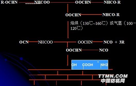 原理:在反應活性很高的聚氨酯活性基團上接上保護基,然后滲透到纖維內部,在130-160℃的焙烘條件下脫去保護基,使聚氨酯與羊毛纖維上的氨基、羥基等活性基團反應,或與并用的氨基硅油等反應,或聚氨酯本身發生交聯反應,形成網狀立體結構的高分子膜覆蓋在纖維表面上,可持久性的賦予纖維各種后整理功能。