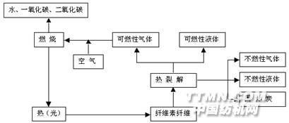 纖維素纖維是碳水化合物,受熱不熔融,遇火后燃燒較快,下圖為纖維素纖維的燃燒裂解過程。