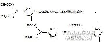 含長脂肪烴的氨基樹脂初縮體 這類化合物主要是高級醇或高級脂肪酸將氨基樹脂初縮體中的部分羥基進行醚化或酯化后的產物。例如:六羥甲基三聚氰胺甲醚與硬酯酸或十八醇反應,可制得這類化合物,反應式如下:
