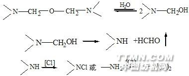 N-羥基甲基化合物整理織物耐洗性與釋放甲醛問題取決于它與纖維素交聯反應生成物的穩定性,實際上是指交聯生成物對酸,堿水解的穩定性。DMEU、DMDHEU及DMPU與纖維素生成的共價交聯,由于氮原子上沒有氫,在堿性介質中不能生成酰胺負離子,所以生成交聯生成物耐堿水洗性很好。但缺點是吸氯,泛黃和氯損。如N-羥基甲基化合物整理的織物,在交聯生成物的組成中,總含有=NH,—NH2,=N—CH2OH及=N—CH2—O—CH2—N=等基團,這些基團在氯漂過程中會分解、吸氯而生成氯胺,即: