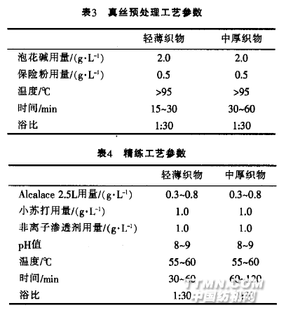 由上表可見.GC 897一H和3273一C酶的脫膠效果好。商品牌號為丹麥NOVO Noldilk公司的A1cMace2.5L是工業(yè)上常用的脫膠蛋白酶.這種酶在脫膠前需要對織物進行預處理。其預處理工藝及精練工藝參數(shù)分別如表3和表4所示