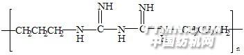 前者水溶性較低,耐洗性較好。主要靠破壞細菌的細胞膜達到殺死細菌的目的。雙胍類對細菌抑制效率高,對真菌抑制效率低。該類產品有日本Leneum公司的商品“通勤快足”。它是使用1,1ˊ-六亞甲基雙 [5-(4-氯苯基)雙胍]二葡萄糖酸酯混入錦綸紡絲原液中,再紡成抗菌纖維。 聚六亞甲基雙胍鹽酸鹽(PHMB)可以用于整理棉及其混紡織物。由Zeneca公司成功開發。結構式: