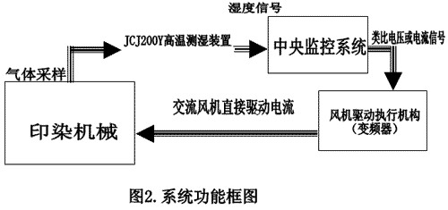 系統功能: (系統框圖如圖2所示) 該系統采用JCJ200Y高溫型測試裝置,將被測環境中的氣體通過采樣風機采到采樣室,然后通過分析調理后把濕度信號送中央集中控制儀。中央集中控制儀采用JCJ600P型智能數字調節儀根據被采集的濕度信號采用模糊控制和PID傳統控制相結和的方式,輸出以連續