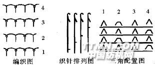 2 產(chǎn)品設(shè)計(jì)2.1 緯平針機(jī)型: 單面圓緯機(jī); 機(jī)號: 28; 筒徑:76.2cm (30in);路數(shù):9O.路;橫密:7O縱行/5cm;縱密:94橫列/5cm;克重:204g/m2。2.2 單面集圈組織2.2.1 機(jī)器條件及上機(jī)工藝參數(shù)機(jī)型:單面四針道針織機(jī);機(jī)號:26;筒徑:76.2cm (30in);路數(shù):9O路;克重:228g/m2。2.2.2 織物組織設(shè)計(jì)在單面四針道針織機(jī)上通過配置成圈與集圈相結(jié)合,在織物表面呈現(xiàn)規(guī)則的凹凸小網(wǎng)眼外觀,增大了織物的表面積,可提高織物的散濕能力。圖1織物上機(jī)圖中分別列出了織物的編織圖、織針排列圖和三角排列圖。.jpg)