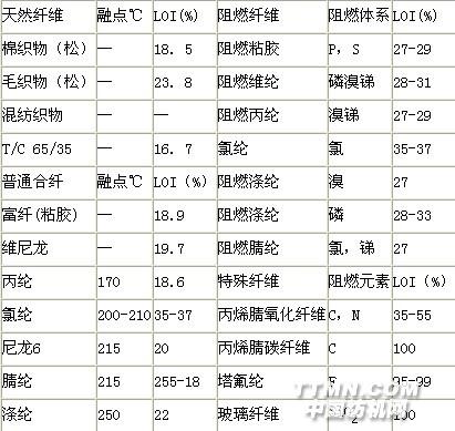 天然纖維祗能依靠后處理方法達到阻燃要求,合成纖維則不然,它可以采取與聚氯乙烯混紡,在紡絲液中添加阻燃劑等辦法制得阻燃纖維,特別是一些阻燃性能特好的碳素纖維,可用作消防員的特殊服裝,現將主要產品列表介紹如下;