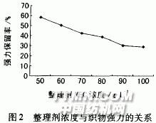 由表1知,NEC樹脂整理織物的干折皺回復角(經+緯)最大,強力保留率也較好,因此選用低甲醛樹脂整理劑NEC做進一步試驗。2.1.2 整理劑濃度的影響.jpg)