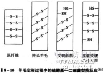 羊毛中的硫醇基與二硫鍵的交換和氫鍵重排反應(yīng),對(duì)羊毛定形起主要作用;加入還原劑、堿劑,或高溫?zé)崴?、蒸汽,增加硫醇基?shù)量,使重排更加容易;二硫鍵與氫鍵重排消除了織物中的不平衡應(yīng)力,使織物呢面平整、尺寸穩(wěn)定 滌/粘或中長(zhǎng)仿毛織物通過(guò)蒸呢可提高織物毛型感,布面平整,光澤柔和,彈性好,生產(chǎn)效率較高