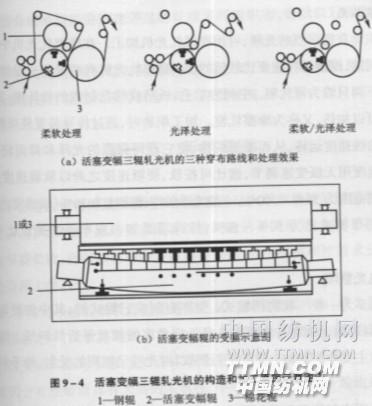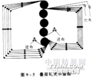 疊層軋光 五輥以上軋光機(jī),如配備一組6~10套導(dǎo)輥的導(dǎo)布架,即可選行疊層軋光,利用織物多層通過同一軋點(diǎn)相互壓軋,使紗線圓勻,紋路清晰,手感柔軟,有似麻布光澤,