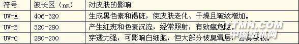 二、應用的機理和功能[一]抗紫外線型化纖1、紫外線的輻射 大陽光中能穿過大氣層輻射到地面的紫外線占總能量的6%,按其波長可分為三個波長UV-A、UV-B、UV-C,紫外線因其滅菌消毒和促進體內合成維生素D,而能使人類獲益。但同時也有加速人體皮膚老化及產生癌變的可能。近年來,世界各國大