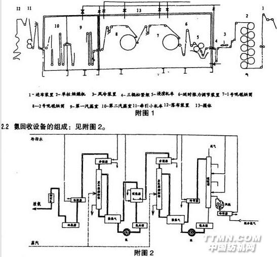 2 設備簡介:我公司使用的液氨整理機為國產第一臺生產樣機,型號YAZL-160。由河南省新鄉印染廠和河南省紡織科學研究院以及有關院校合作,歷時4年多時間,在認真分析研究上海第二印染廠從美國莫里森公司引進的一套液氨整理技術設備和回收裝置的基礎上,自行設計制造的,并于1992年經過了原紡織部組織的驗收。目前我們已在該設備上開發生產了上百種產品,累計生產量達1500萬米以上,取得了很好的經濟效益和社會效益。2.1 主要技術系數: 車速: 6-30 m/min 延時調節范圍:4.5-25秒 強力控制范圍:0.78-3.0 N/cm 氨最大循環量