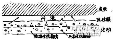 具體作法是:1.用18.43特×18.43特(32?s×32?s)純棉針織汗布為基材,重量162克/米?2。2.采用S法抗菌處理。即多種抗菌物質的復合處理。其中部份抗菌物質呈微溶性并覆蓋在有孔的柔軟性薄膜之下,以延長釋放期。如下圖所示。