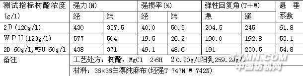 苧麻織物具有許多優良性能,但它的手感差,抗皺性能更差。而經常規樹酯整理后,苧麻織物強損極大,幾乎沒有實用價值,多年來,人們做過大量的研究工作[1—4]。但對提高苧麻織物樹酯整理后的抗皺而又不過分損傷強力的防脆化措施報道 甚少,尚缺乏有效方法,本文以2D及WPU為整理劑,添加新型防脆化劑,進行了大量的試驗工作。