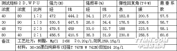 2.結果與討論:2.1. 2D與WPU用量的影響2D與WPU兩種樹酯整理劑整理效果如表1..從表1中可看出,單獨使用2D時,彈性好、強損大,單獨使用WPU時,強損少,手感好。2D與WPU各半分配時,各項指標在二者之間。由于2D性能已為人們所熟知,增加用量只會增加強大的強損,那么增加WPU的用量,是否會使彈性提高呢?為此我們進行增加 WPU用量的整理試驗,結果如表2表1. 2D、WPU、2D/WPU整理效果比較: